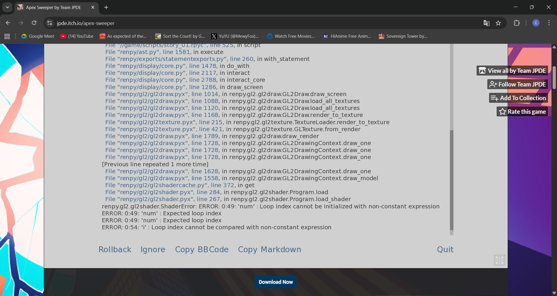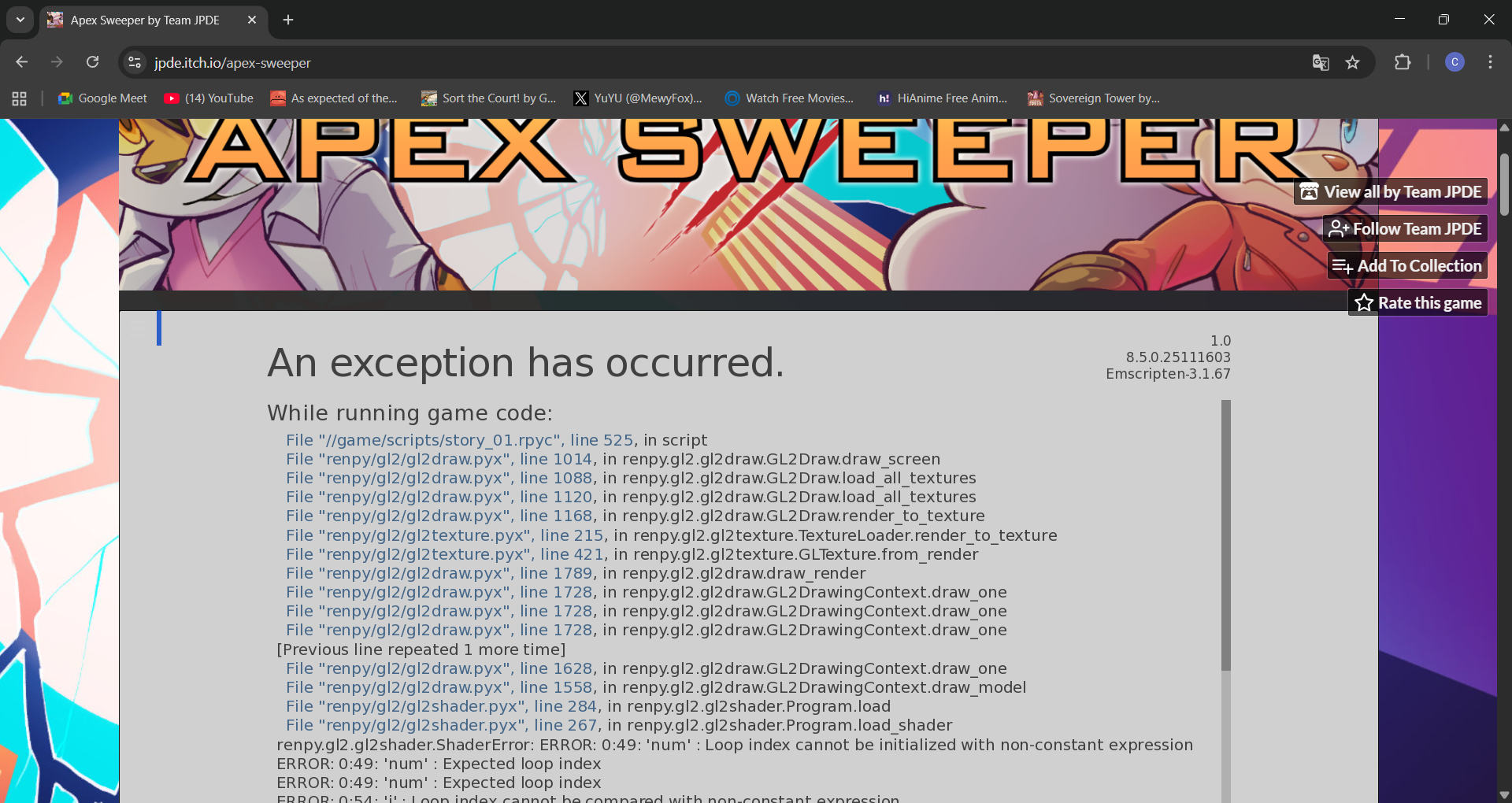 i have a problem on the web version when i get to the club where Lanolin talks when i click to advance the text an exception has occured that apears after the text i wont slow them down i promise and while im gone you can get to know eachother when i advance the text the an exception has occured text apears none of the options are working in fixing the problem