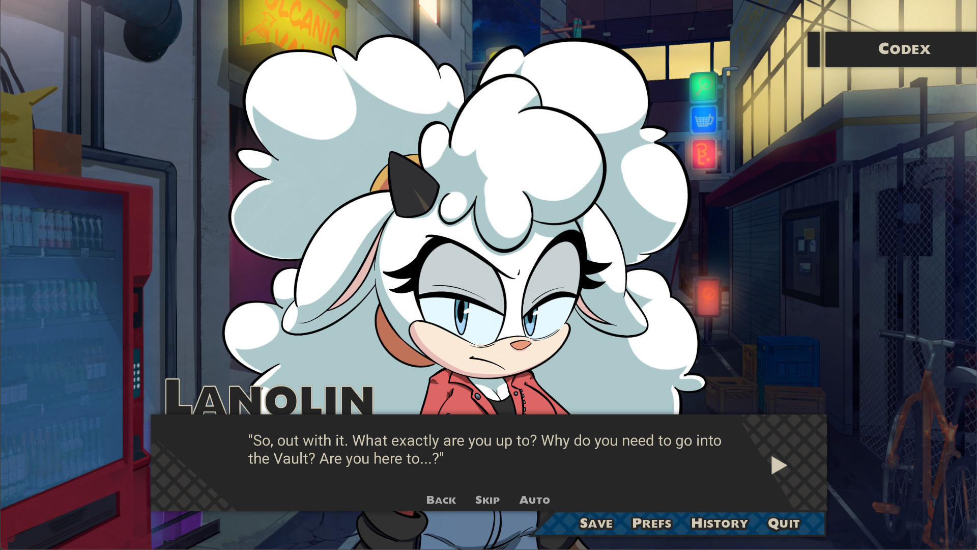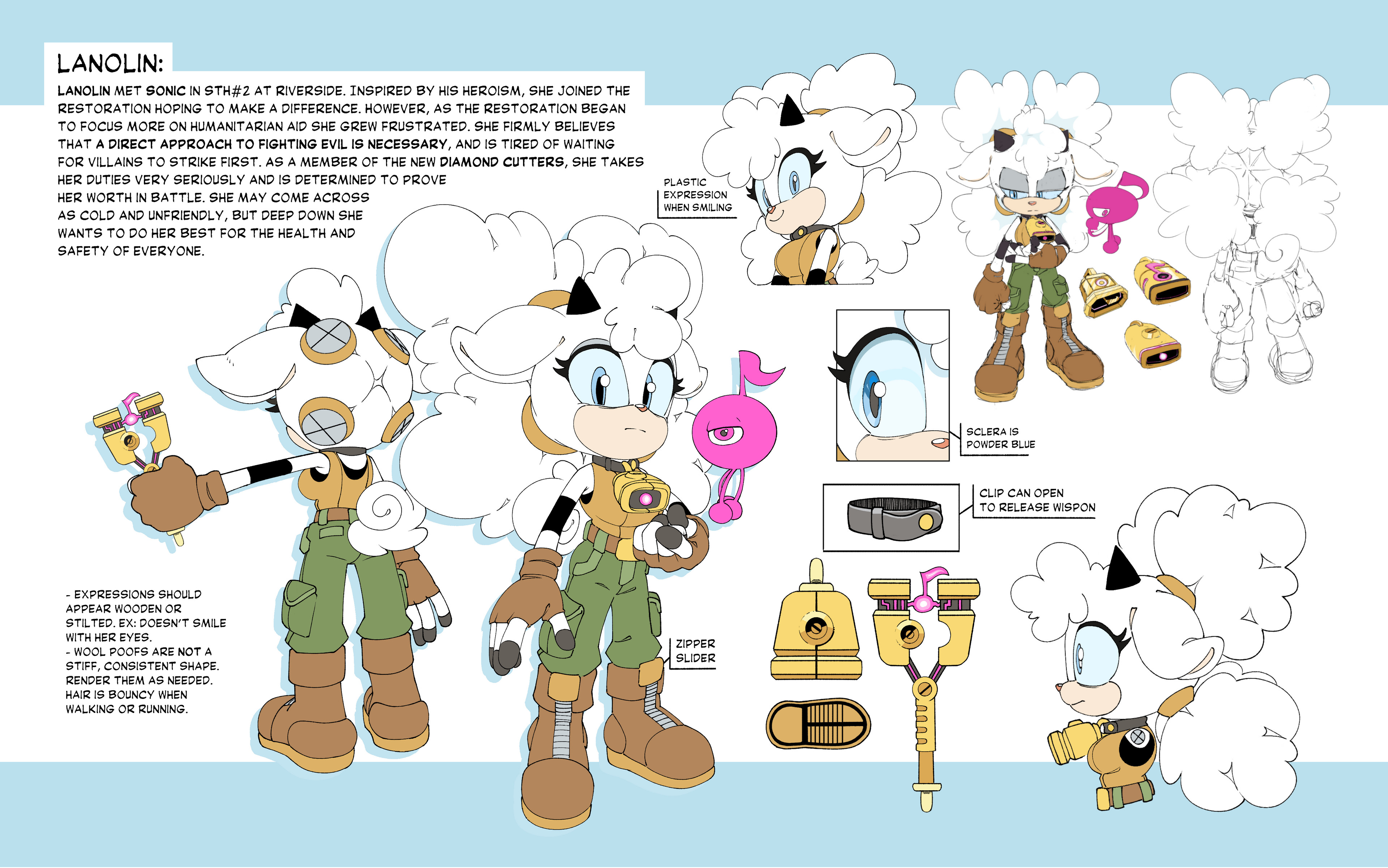 As you probably guessed by playing Episode 01, my favorite character is Lanolin the Sheep. For a number of reasons, but I guess the main one –from a narrative standpoint- is because she represents something I wish we could see more of in the series –although I understand why we do not-: she starts as a bystander, just another citizen of Mobius –that's what I call the main continent of Sonic's planet- who answers the call to action after yet another crisis in the face of which she found herself powerless. She doesn't fall into adventure, she chooses to get involved, and because of that her perspective on many things is quite unique.